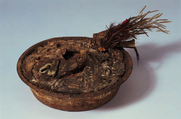 Tin bowl filled with earth in which are embedded cowrie shells, quills, a padlock, and the hammer from a flintlock gun. acquired by Sir Cuthbert E. Peek after its display in the Accra section of the West African Court at a Colonial Exhibition, donated by him in 1891. Once labelled a 'sorcery concoction' this is now thought to have been made as a shrine for a god. 16 cms diameter. (1891.40.1).