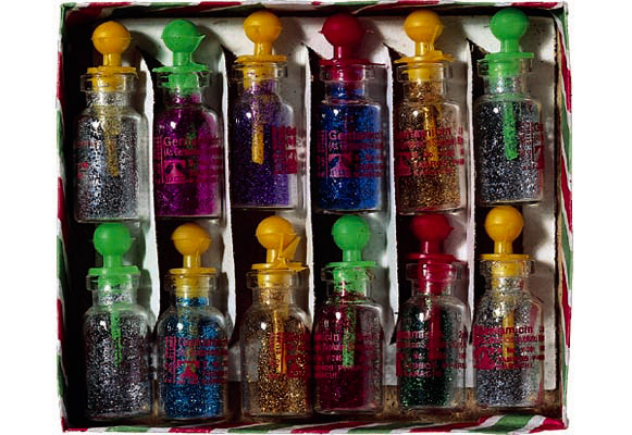 Pack of twelve bottles, containing glitter eye make-up, originally made and used as injection vials for antibiotics. Purchased for the Museum by Marina de Alarcon and Mark Axworthy at a stall near the Bazaar Kasaaban in Peshawar, Pakistan in September 1999. Each bottle 4cm high. (1999.33.67).