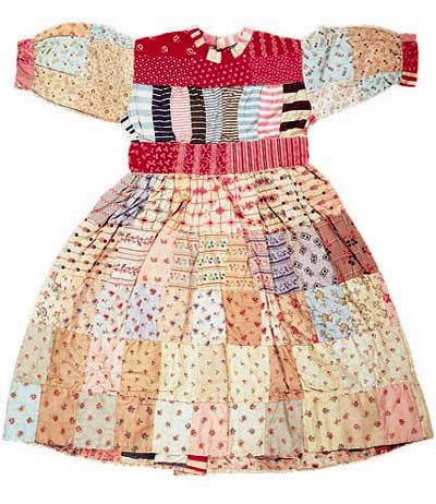 Dress, probably from Syria but acquired in Palestine in the mid 1880s by Miss Mercy Watson. Described in the original Museum register as 'Gypsey girl's patchwork dress'. From the inside it is possible to see that some of the patches must have been cut from other garments or furnishings. It has been made from contemporary cotton printed cloth in the style of late nineteenth century European fashion. The patchwork gives it an informal feel, although the pieces have been carefully arranged to give order and symmetry. For example darker pieces of cloth have been arranged to form two strong red bands that frame the top and bottom of the bodice, and all the strong linear patterns have been grouped together. 70 cms long. (1967.28.55).