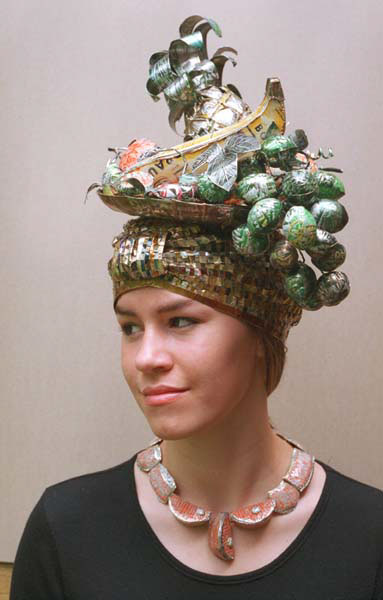 'Carmen Miranda Hat' made from reused aluminium drinks cans by Val Hunt in 1999. Hunt uses this pliable an light material in much the same way that a textile artist uses fabric. She cuts, weaves, pleats and frills a two dimensional material to make a three dimensional form. 25 cms high. Photograph courtesy of the artist.