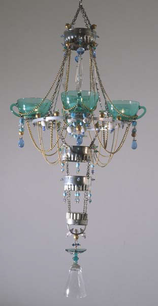 'Copenhagen' chandelier made from Pyrex cups, pastry cutters, and other domestic materials by Madeleine Boulesteix (born 1963) in 1999. 72 cms high. Photograph courtesy of the artist.