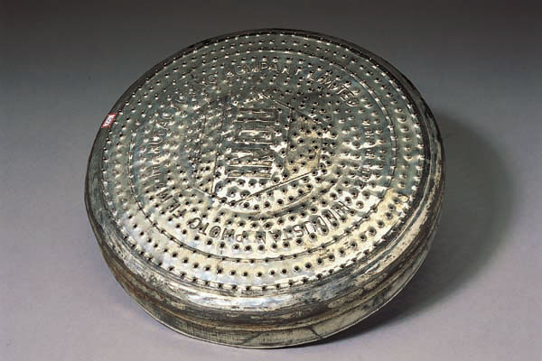 Sieve made from movie-film canister perforated with holes by Asif Pasha. Purchased at KGN Metals, 45 Silver Jubilee Park Road, Bangalore, India. 28cms diameter. (1998.25.17).